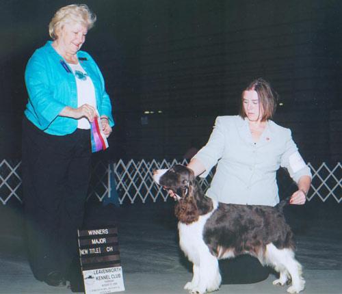 MAR-RIC KayNDee Beautrix Kiddo “Kiddo” Kiddo is one special girl. Not only is she a titled Grand Champion, and earned her CGD title, she is also in International Therapy dog and has been known to visit the local Ronald McDonald Houses in the Dallas Texas area along with Hospitals, and rest homes. Her temperament is flawless, cheerful and gentle. She loves the show ring and as her beloved owner Dick Meisch is known to say, “She plays to the crowd”. Her temperament, beauty, and structure truly represents what a Springer should be. |