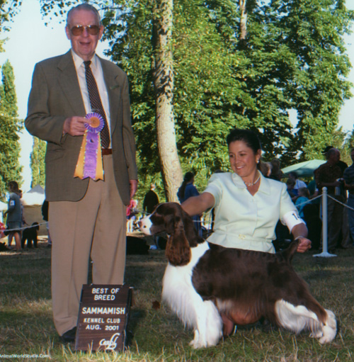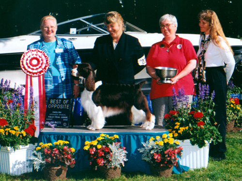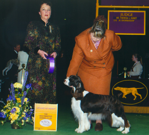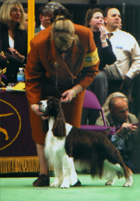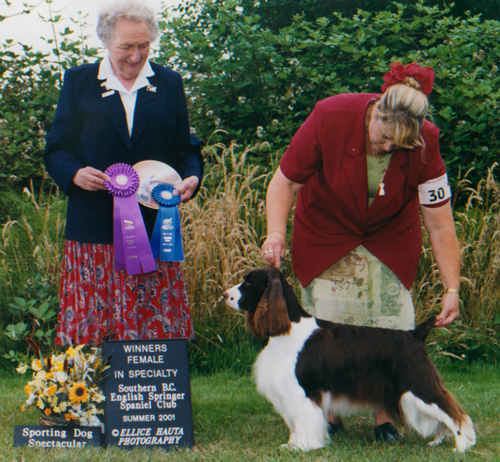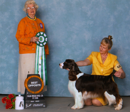 AM/CAN CH Ramblewood Centerfold “Trixie” AKC # SN654678/07 OFA 32G CERF Clear DNA # V378952 AM/CAN CH Serenade's Storm Warning x CH Ramblewood The First Noel Meet our foundation bitch, Trixie, her beauty, elegance, temperament, structure, and soundness is mirrored in the English Springer Spaniel Standard. Her many accomplishments in the Show Ring support this statement. Her offspring are validating the contribution that she will make in the breed for many generations to come. In the Show Ring, Trixie easily finished her Championship with 5 major wins as a young girl. She went on to become one of the top three Springer Bitches in the years 2002 and 2003. She was Best Of Opposite Sex in both the ESSFTA and CKC National Specialties in the same week in 2002. Trixie then went on to New York for the Westminster Kennel Club show, and won an Award of Merit over many Best In Show winning Springer's in the ring. Throughout her career she won many Breed and Group placements. Her love of the sport, beauty, elegance, and structure caught the eye of many judges. In the whelping box in 2003, she became the talk of the town again by giving birth to 9 bitches in her first litter! To have a single sex litter that large was itself amazing, let alone, have them all be beautifully marked bitches. She was the envy of many breeders. To date, 6 of the girls have finished their Championships with a breeze. In total, Trixie has given us 18 show quality offspring, of the 18 there were 14 bitches and 4 dogs. To date, 8 of them have finished their Championships, with 6 others currently showing, many of them pointed. She is now a Granddam of many show quality pups, and so it goes on, her legacy in the show ring, and many beloved family companions ...